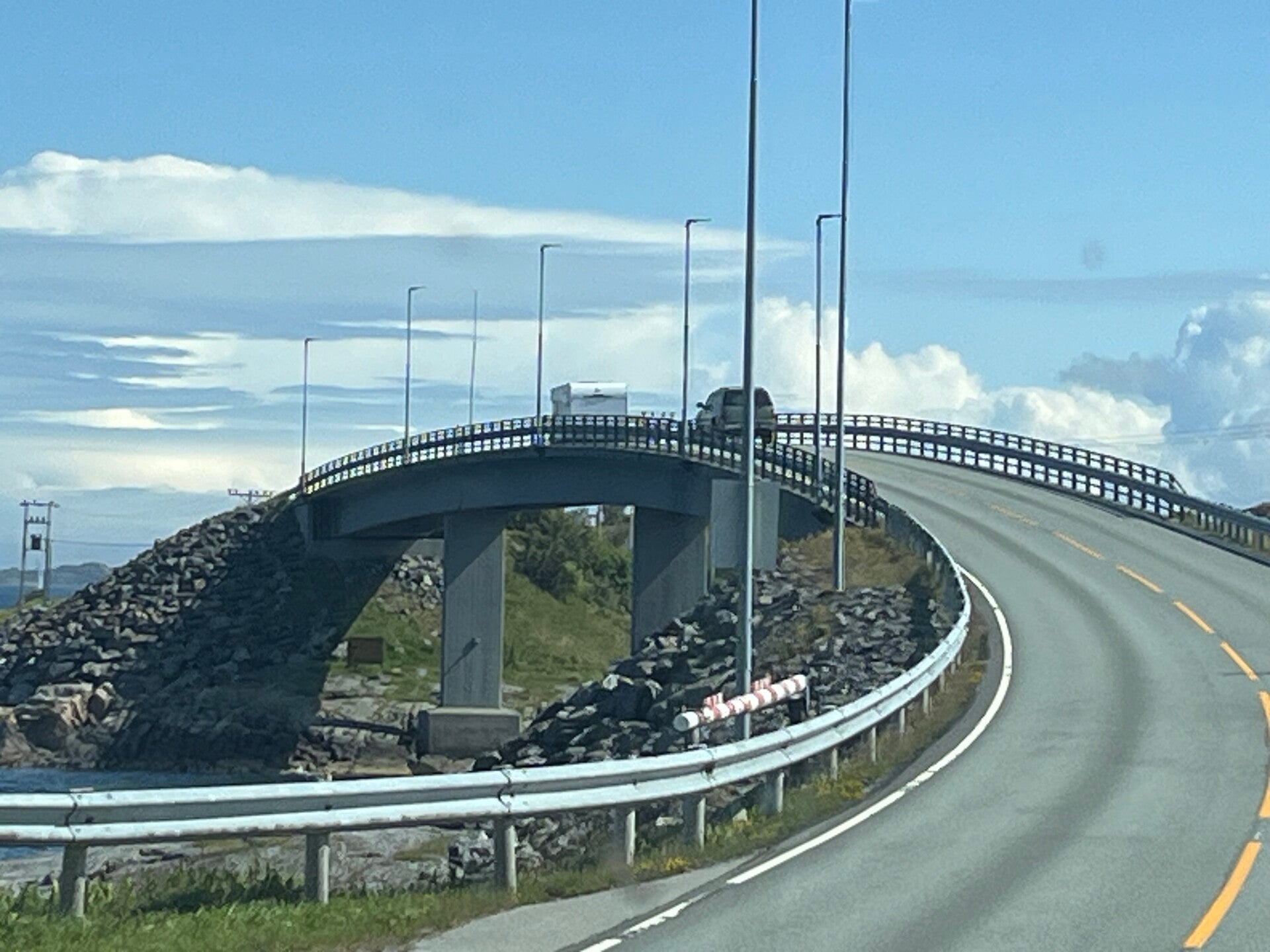 Während wir uns im letzten Jahr selbst etwas unter Zeitdruck gestellt hatten um in der Mietdauer des Wohnmobils bis zu den Lofoten und dem Nordkap voll auszunutzen, hatten wir ja in diesem Jahr keinen Zeitdruck. Wir versuchten also in der Folgezeit immer die Straßen zu fahren, die am nächsten zum Meer lagen. Das beinhaltete dadurch jede Menge Fährenfahrten, von 10 Minuten bis zu 1,5 Stunden, hatte aber den Vorteil, dass kaum Verkehr herrschte. Unsere nächste Station war Bud mit einem nagelneuen Wohnmobilstellplatz direkt am Meer, der sogar eine offene Waschanlage für Wohnmobile hatte. Wir unternahmen einen Spaziergang auf dem gut angelegten Küstenpfad nach Bud. Dort fand gerade eine open-air Theatervorstellung mit mittelalterlichem Inhalt statt, dadurch war das Dorf fast menschenleer. Bud war auch der Anfang der vielgerühmten Atlantikroute, als schönste Strecke am Atlantik angepriesen wird. Die Brücken waren eindrucksvoll, aber insgesamt war die Strecke doch nicht so spektakulär.