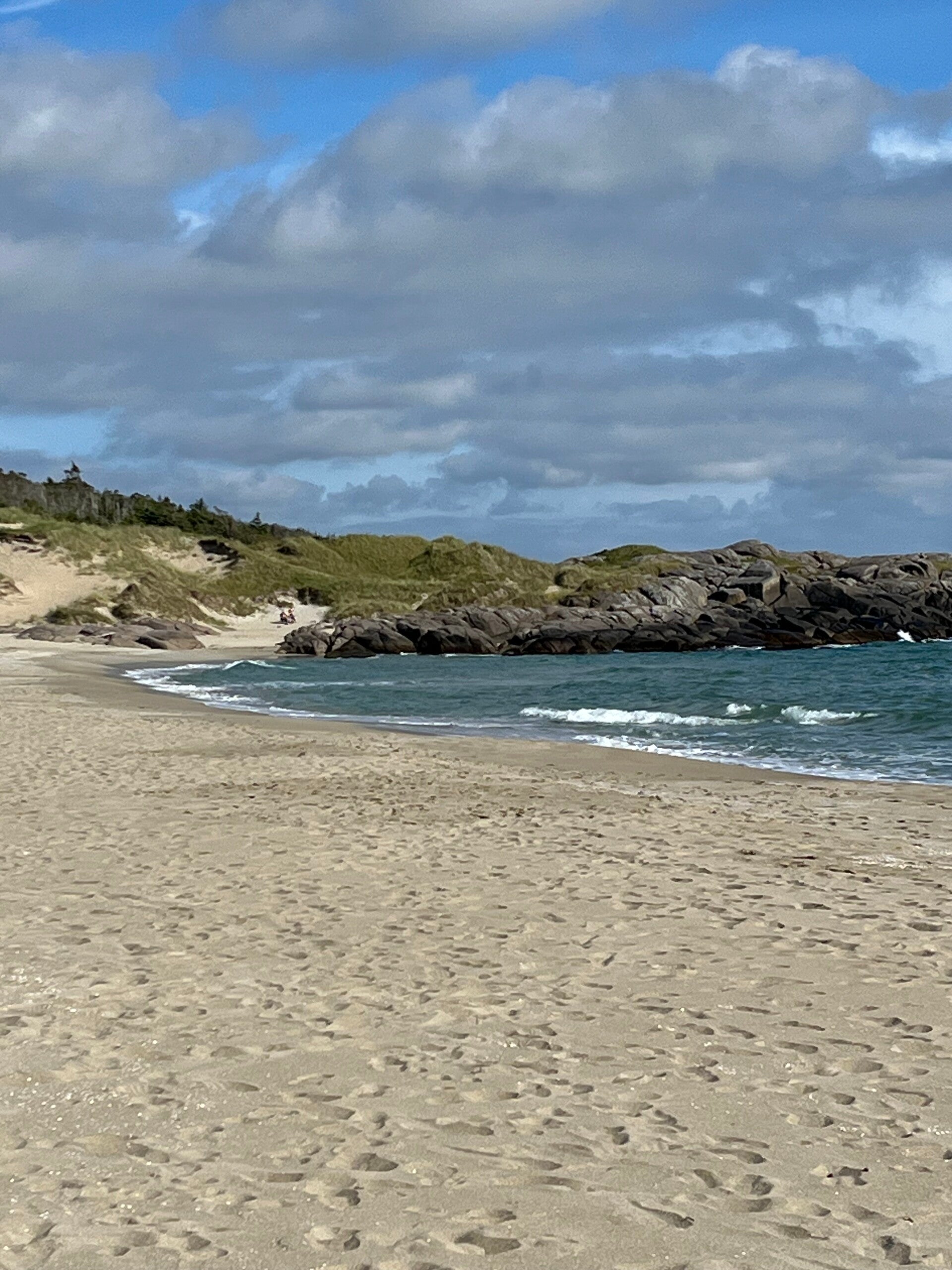 Watson ließ sich „überreden“ bis 6:30 Uhr zu schlafen. Wieder herrlicher Sonnenschein! Nach dem Frühstück haben wir eine kleine Klettertour durch die Felsen gegenüber von Leuchtturm unternommen, dann ein paar Postkarten mit der Sonderbriefmarke und dem Leuchtturmstempel geschrieben und Ruhe und Sonnenschein in der nahen Meeresbrandung genossen. Die Weite und Impression der rauen Landschaft ließ uns an den Weg Wilfrieds denken, ihn umarmen und Manu gedanklich beistehen. Dann mussten wir wieder zusammenpacken und auf der Serpentinenstraße am Meer entlang Richtung Sandstrand am Atlantik fahren. Nächstes Ziel ein Golfplatz bei Ogna, bei dem man nach dem Golfspielen kostenlos übernachten könne. Leider war der durchaus weitläufige und schöne Golfplatz wenig ansprechend zur Übernachtung … ein netter Nachbar verpestete die Luft mit einem riesigen Feuer. Also fuhren wir lieber auf den Ogna Campingplatz. Gute Endscheidung: schöner Stellplatz, super saubere Sanitäranlage und ein wirklich super SANDSTRAND!!! Watson war wie wir hell begeistert, konnte er doch endlich einmal dem Geschirr und der Leine entkommen und rumtoben. Am Abend wurde ordentlich geduscht (Ellen eiskalt … Hardy warm) und dann im Freien gegessen, wir hatten erstmals Tisch und Stühle ausgepackt - wunderbar… echtes Midsommerfeeling..
