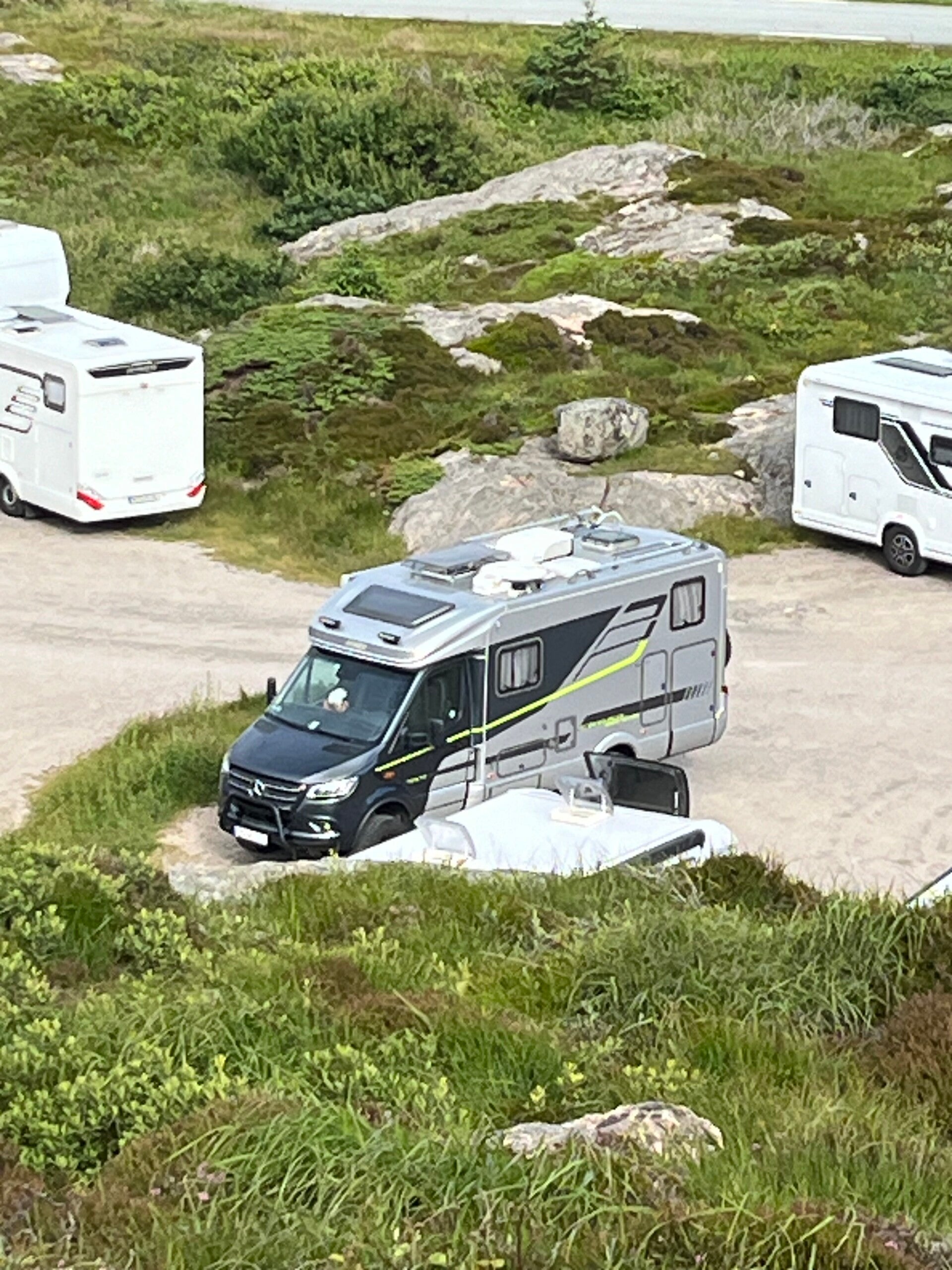 Aufwachen am Eidfjord mit der Überraschung, dass das Kreuzfahrtschiff Aida direkt vor unserem Wohnmobil angelegt hatte. Wir schauten uns das Spektakel an, genossen unser ausgiebiges Frühstück in der Sonne und die Aktivitäten der Aida-Touristen: diese radelten zum Vøringfoss, fuhren mit der Minilokomotive zum Aussichtspunkt und mit dem Bus zum Sightseeing oder flogen mit dem Wasserflugzeug über den Fjord und hatten Spaß beim Speedbootfahren oder einer Kanutour. Wir ließen all dies auf uns wirken und machten am späten Nachmittag unsere ausgiebige Wanderung entlang des Flusses zum Hochplateau. Hundert Meter über dem Meeresspiegel befinden sich prähistorische Grabstellen aus der Eisen- und Wickingerzeit. Wir hatten einen wunderbaren Blick hoch in die Berge und hinunter über den Fjord. Während unseres späten Abendessens legte die Aida ab und verschwand im Gegenlicht der Mitternachtssonne. Das letzte Bild zeigt einen ortstyposchen Einstieg in eine "Wanderweg"!
