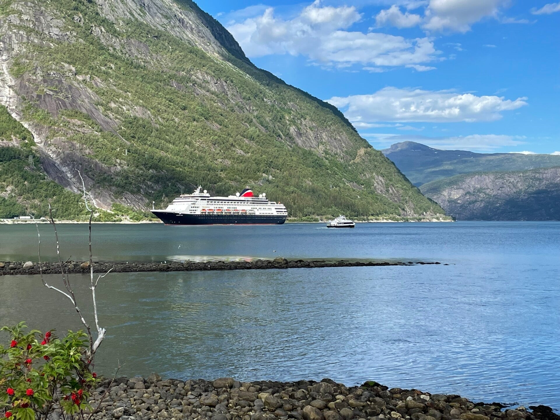 Von Tyssen führt unser Weg zurück auf die E7. Diese schlängelt sich entlang des Hardangerfjords in den Bergen mit wunderbarem Blick direkt auf das Wasser und die rauhen Berge. Offensichtlich waren nicht nur einspurige Engstellen, die auch uns vor dem entgegenkommenden Bus zwangen rückwärts zurück zu fahren, sondern auch Baustellen, die durchaus einstündige Wartezeiten abverlangten, zeitverzögernd. Eilig darf man es hier nicht haben! Steinsfalsfossen, der Wasserfall unter dem man hindurch gehen kann, beeindruckte uns. In Eidfjord fanden wir unsere nächste Station direkt am Wasser. Wir entschieden uns spontan einen Tag Fahrpause einzulegen, das gute Wetter zu genießen und unsere nächste Wanderung anzugehen.