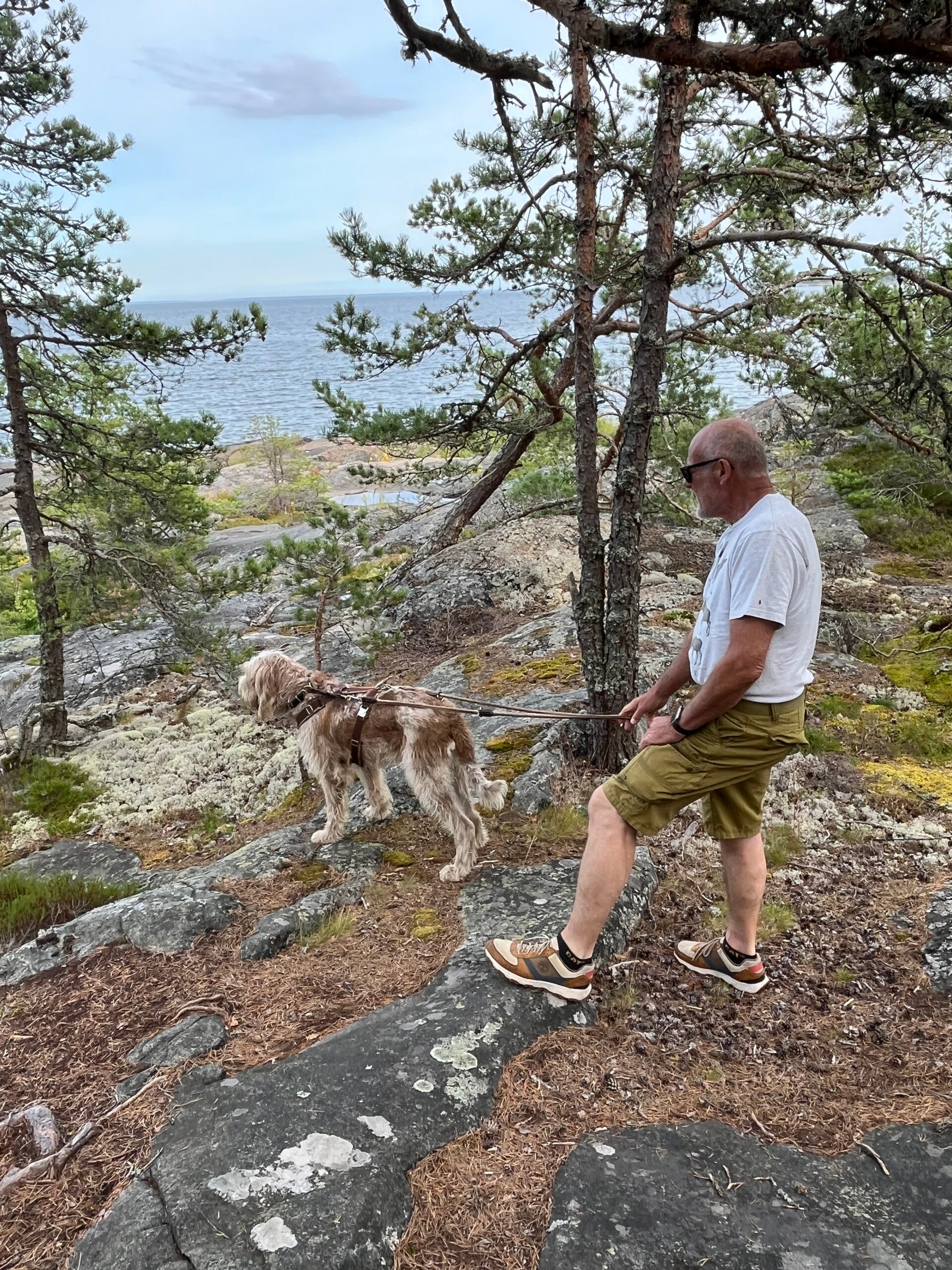 Der Nachbar neben uns wollte früh mit seinem riesigen Wohnmobil, Marke Bus/Eigenbau, aufbrechen. Das konnte er nur mit dem nötigen Rangierabstand. Mit Watson, dem Frühaufsteher, war das kein Problem. Frühstück und kleiner Hafenrundgang waren locker möglich. Wir verließen den Hafen von Böda und fuhren weiter nach Norden. Ein Stellplatz in Nabbelund, an der ehemaligen Fährstation war schnell gefunden. So konnten wir am Nachmittag zum Leuchtturm Erik -durch den Elchwald und entlang der wunderschönen Felsküste- wandern. Watsons Nase war voll im Einsatz und er überquerte routiniert fünf Viehsperren. Unglaublich, mit welcher Konzentration und Koordination er die langen Beine an den richtigen Platz setzte. Unser Abendessen hatten wir aus der Fischräucherei und aus der mit Abstand besten Bäckerei (beide in Böda) unserer bisherigen Reise …. lecker war’s !