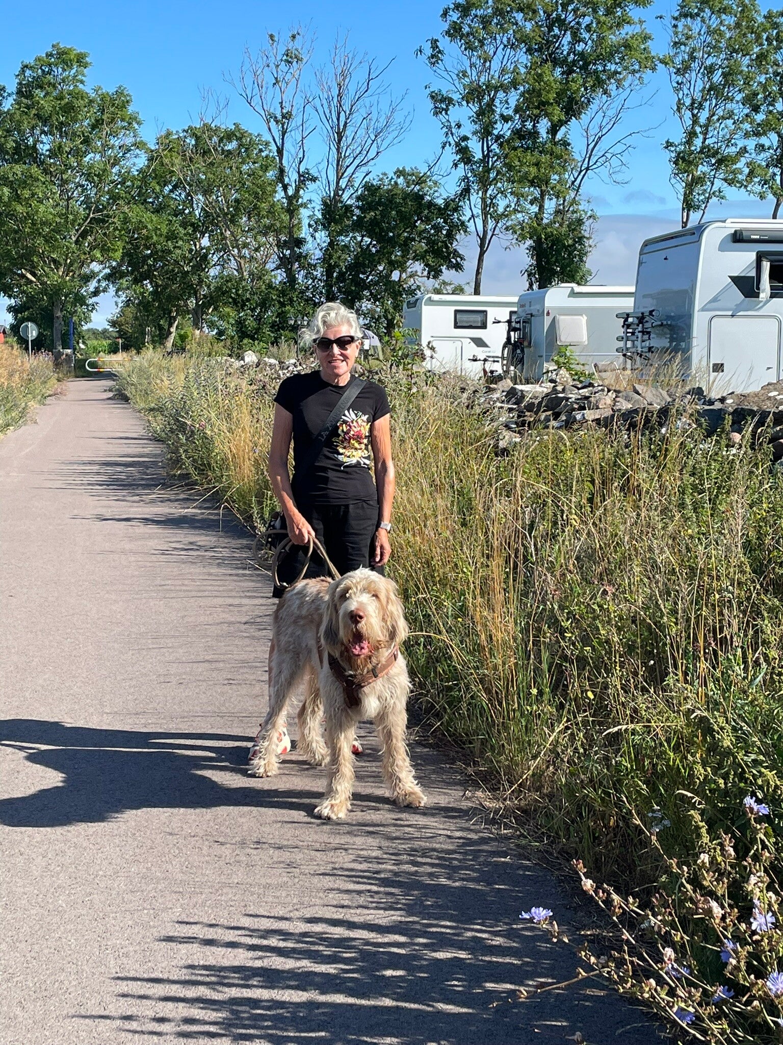 Heute fuhren wir zeitig und ohne Frühstück los, damit wir Aussicht auf einen Stellplatz am Strand in Skanör hatten. Dies sollte zunächst auch gelingen. Die ersten Wohnmobile fuhren ab und wir parkten ein - direkter Blick auf die Kopenhagenbrücke, ein designiertes Strandbad mit jeweiligem Badesteg für Männer und Frauen getrennt und ein großer Jachthafen luden auch uns ein. Hardy buchte mit der App das Ticket, schloss den Strom an und wir frühstückten… dann ging der Strom aus. In der Ursachenforschung stellte sich heraus: wir standen auf dem Parkplatz, den wir nicht bezahlt hatten. Also parkten wir um und gingen an den Strand. Watson spielte Ball, prüfte mit der Pfote die Güte des Wassers … er blieb wasserscheu, wiewohl Ellen mit den Füßen in der Ostsee stand. Heidelbeeren und Joghurt zu Mittag waren lecker aber ein Blick an unsere Windschutzscheibe dämpfte unsere Laune erheblich: ein gelber Strafzettel zu 1000 Kronen! Wir hatten offensichtlich trotz 24 Stunden Parkticket falsch geparkt. Es begann zeitgleich aus Eimern zu regnen, das passte!!! Nun waren aber alle legal möglichen Stell- und Campingplätze belegt. Wir fuhren los und fanden im nächsten Jachthafen Richtung Malmö, in Höllviken, einen Standplatz. Dort konnten wir ab 18 Uhr bei nachlassendem Regen die Jachten und Fischerboote ein- und ausfahren sehen. Die Besatzungen begrüßten sich enthusiastisch 🤩.