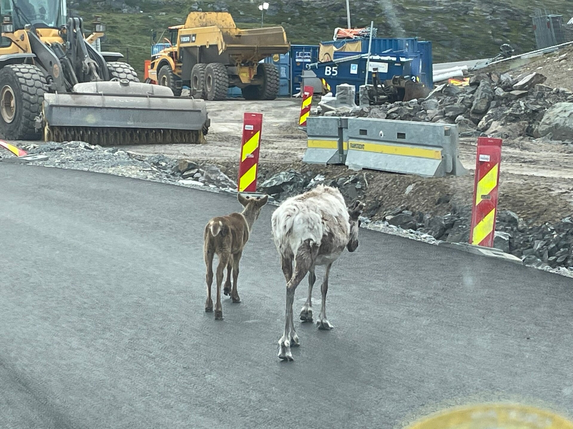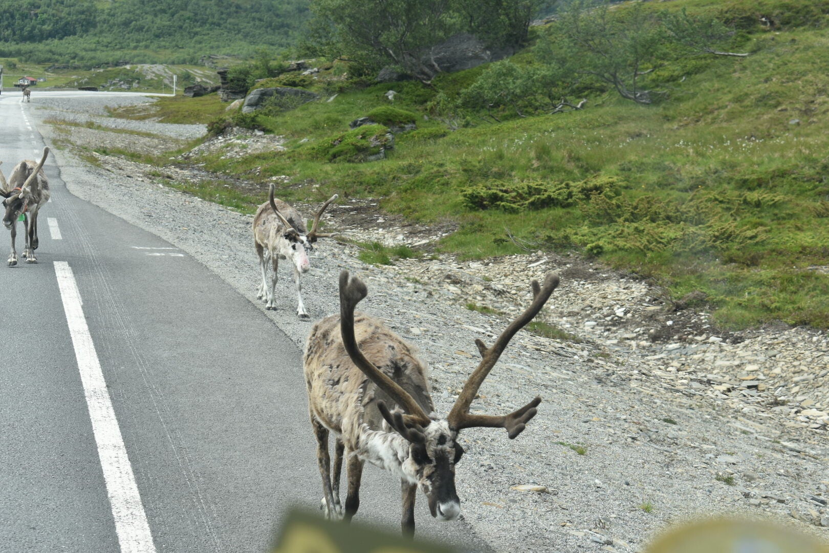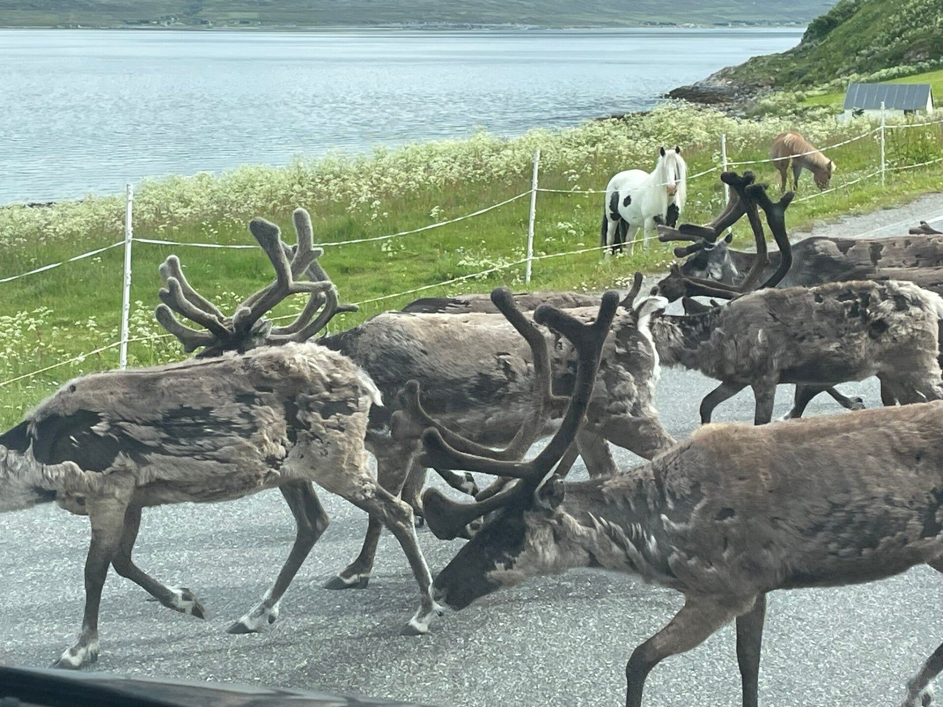 Aufwachen nach einer stürmischen Nacht … wir fühlten uns wie auf hoher See! Draußen war der Wind so stark, dass wir nur einige Abschiedsfotos machten und dann die Reise nach Hammerfest antraten. Dort hatte Hardy den Stellplatz am Hafen ausgesucht. Auf dem Weg dorthin begegneten uns wiederum zahlreiche Rentiere auf der Straße. In Hammerfest ergatterten wir den letzten Stellplatz mit direktem Meerblick und die Sonne begrüßte uns. Zunächst waren wir von Hammerfest etwas enttäuscht, aber dann entschädigten das Polarmuseum, die Kirche und vor allen Dingen der steile Aufstieg im Zickzackpfad zur Emergentroute bzw. Postalroute führte. Watson entdeckte seine neue Leibspeise, die es überall in der Stadt gab: Rentierkot! Diesen begegneten wir auch mitten in der Stadt. Nach leckerem Abendessen draußen und bei voller Sonne ließen wir den Abend ausklingen. Der nächste Morgen erwartete uns hier noch mit Sonnenschein.