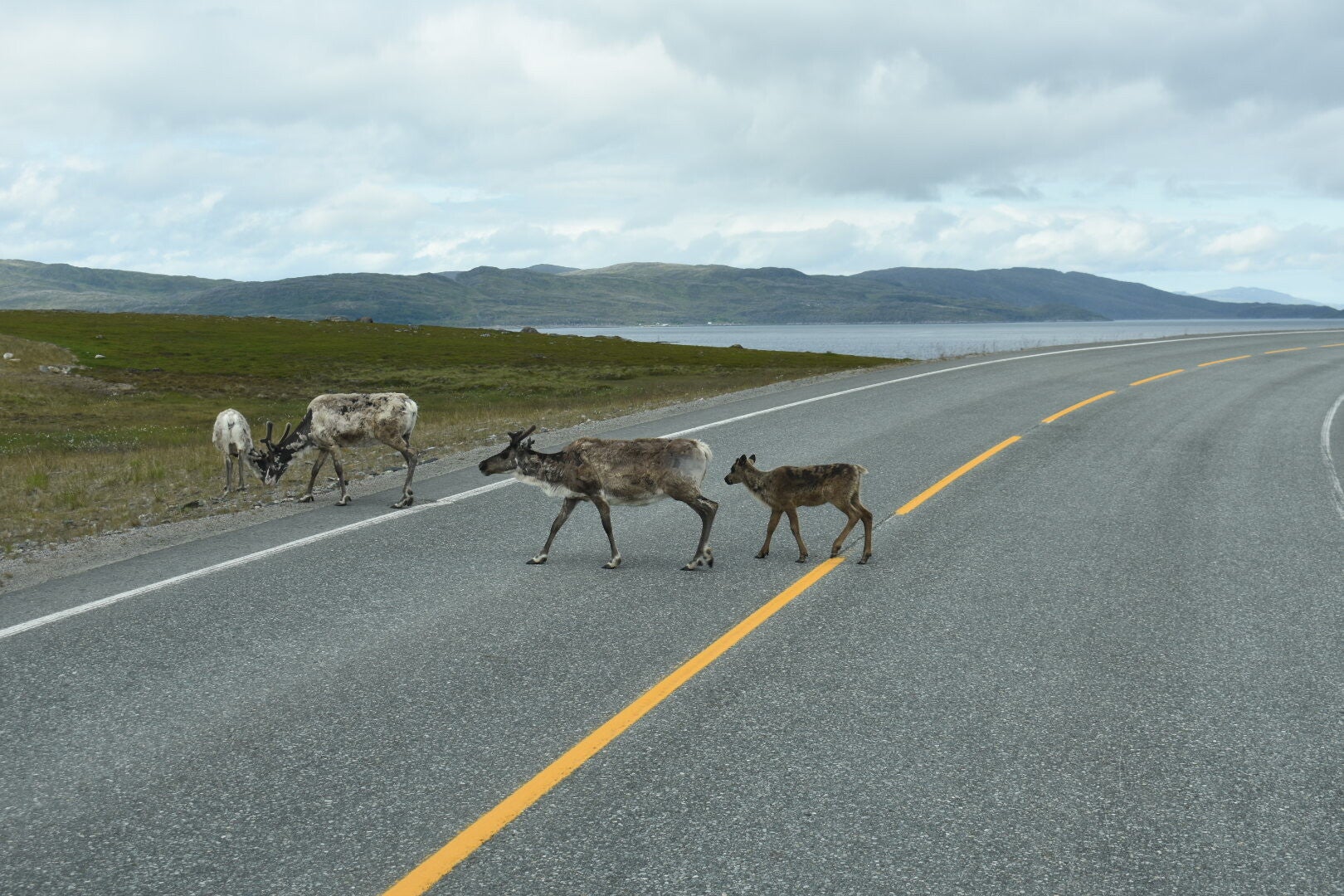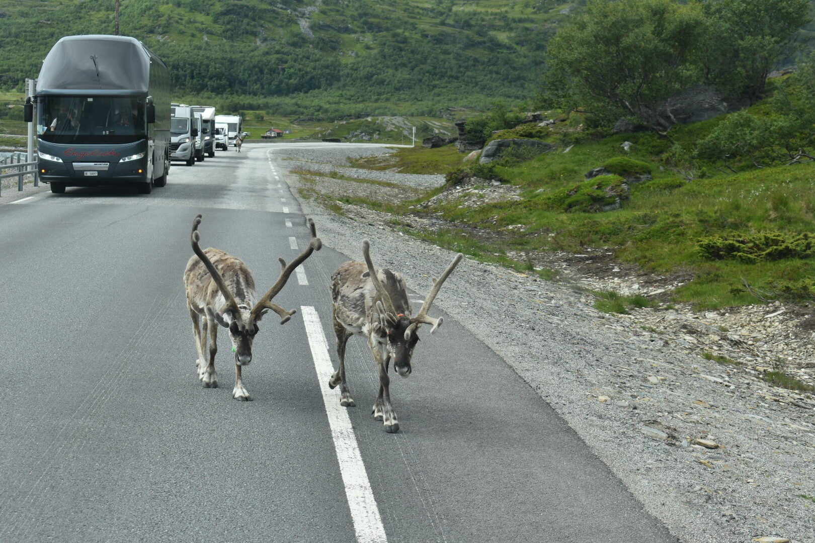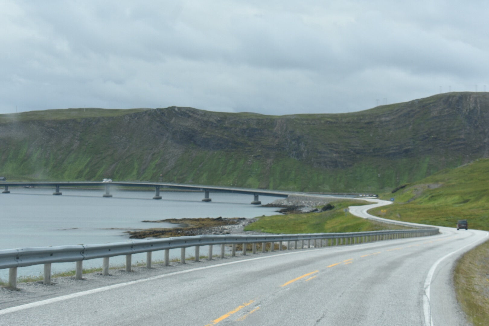Aufwachen nach einer stürmischen Nacht … wir fühlten uns wie auf hoher See! Draußen war der Wind so stark, dass wir nur einige Abschiedsfotos machten und dann die Reise nach Hammerfest antraten. Dort hatte Hardy den Stellplatz am Hafen ausgesucht. Auf dem Weg dorthin begegneten uns wiederum zahlreiche Rentiere auf der Straße. In Hammerfest ergatterten wir den letzten Stellplatz mit direktem Meerblick und die Sonne begrüßte uns. Zunächst waren wir von Hammerfest etwas enttäuscht, aber dann entschädigten das Polarmuseum, die Kirche und vor allen Dingen der steile Aufstieg im Zickzackpfad zur Emergentroute bzw. Postalroute führte. Watson entdeckte seine neue Leibspeise, die es überall in der Stadt gab: Rentierkot! Diesen begegneten wir auch mitten in der Stadt. Nach leckerem Abendessen draußen und bei voller Sonne ließen wir den Abend ausklingen. Der nächste Morgen erwartete uns hier noch mit Sonnenschein.