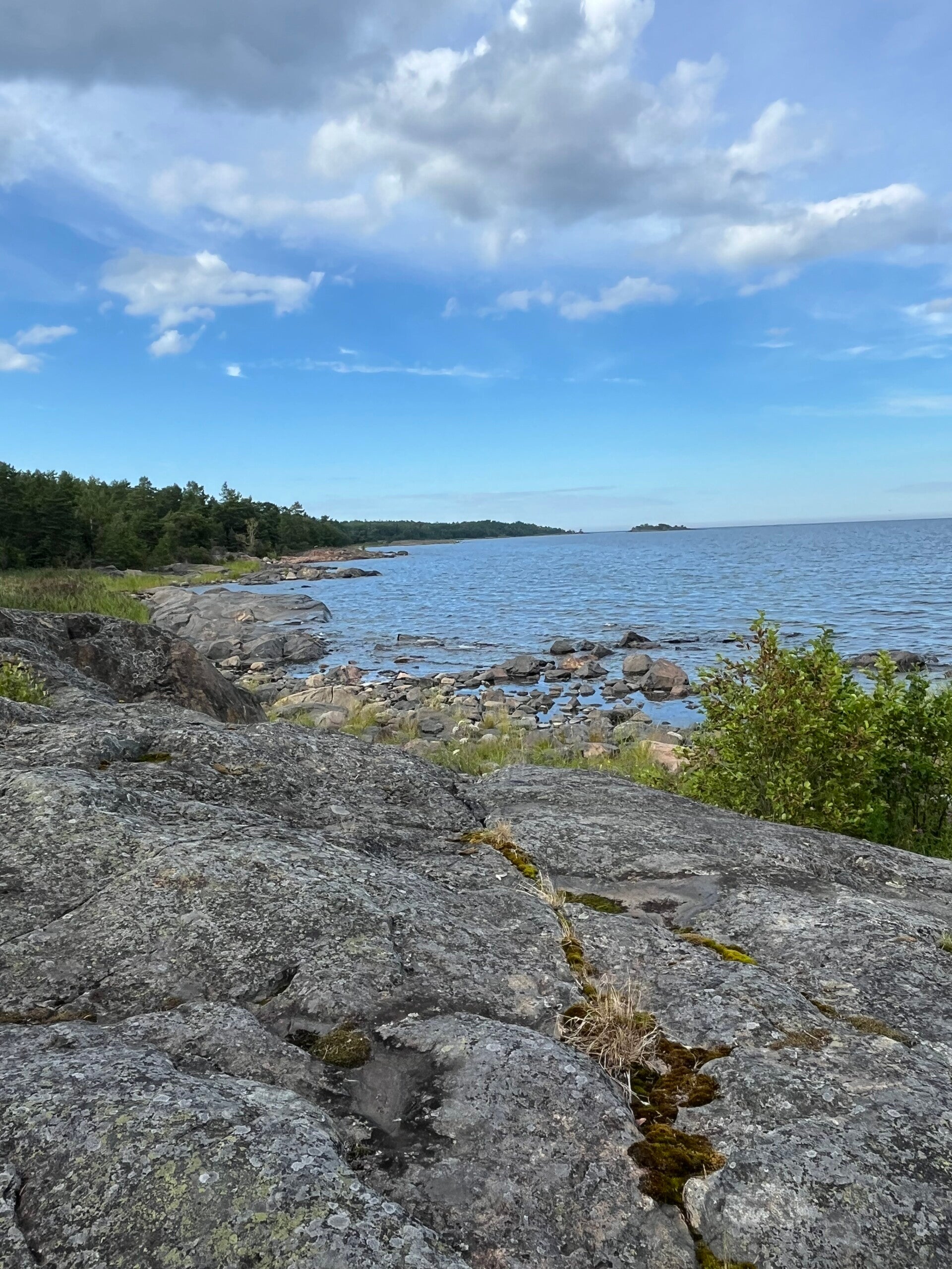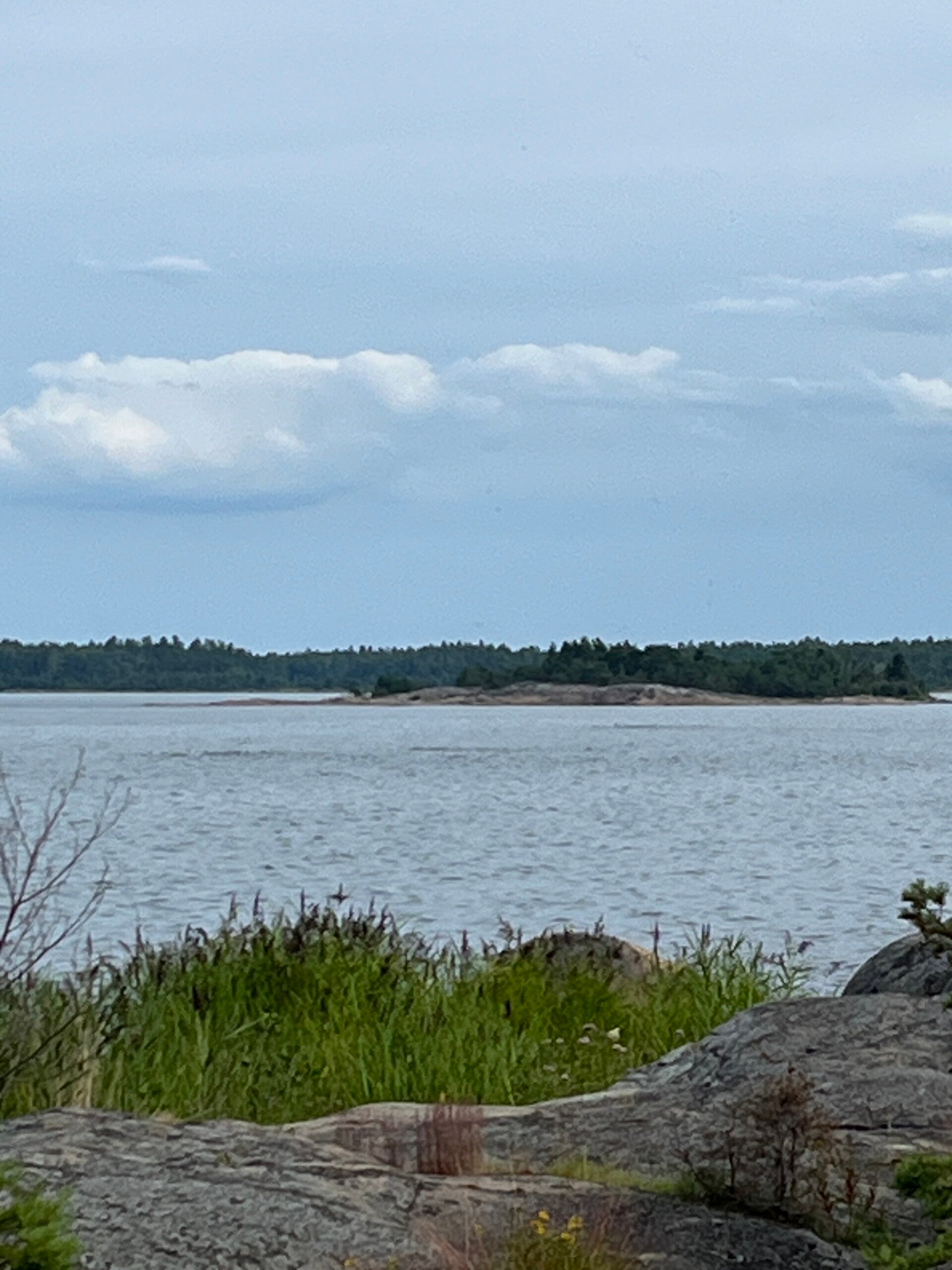 Nach einem ausführlichen 9km langen Spaziergang durch die Kiefer- und Birkenwälder, entlang des Eisenbahnmuseums, waren wir alle erschöpft und genossen die Nachmittags-Sonnenstunden und unser wunderbar leckeres Salat-Hähnchenmenue. Watson war froh, dass wir nicht fahrend unterwegs waren. Das Frühstück am Sonntag in der Morgensonne, das Auffüllen unserer Vorräte und die kurze Fahrt zum ältesten Leuchtturm Skagsfyr, ein Geschenk der Seeverwaltung Schwedens an die Stadt Jävre, folgten. Wir blickten direkt auf den Bottnischen Meerbusen und konnten bei Sonnenschein draußen essen.